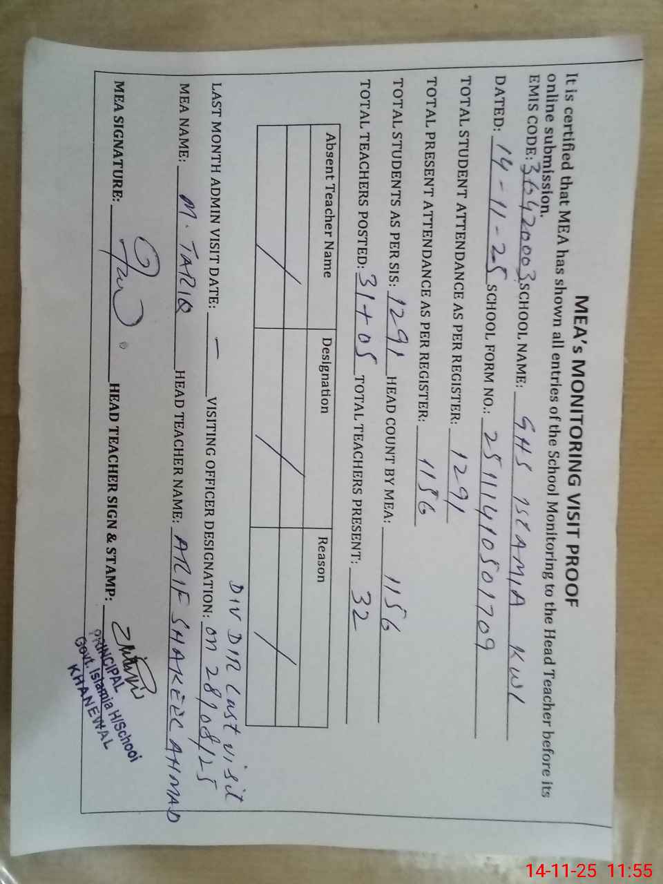 | Attendance Register | Head Teacher | MEA with School | Visit Proof |