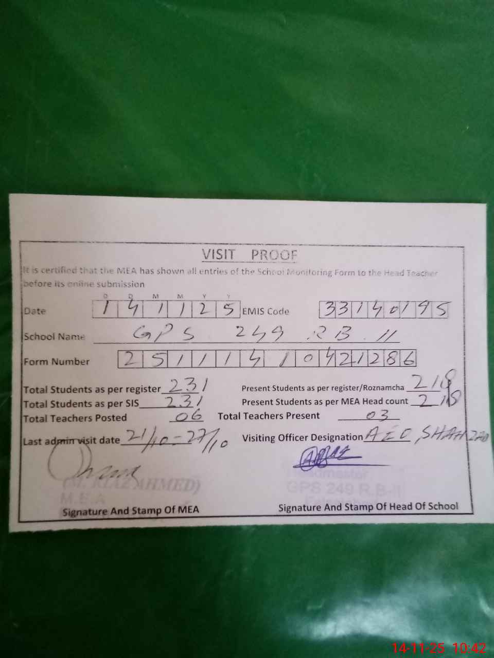 | Attendance Register | Head Teacher | MEA with School | Visit Proof |