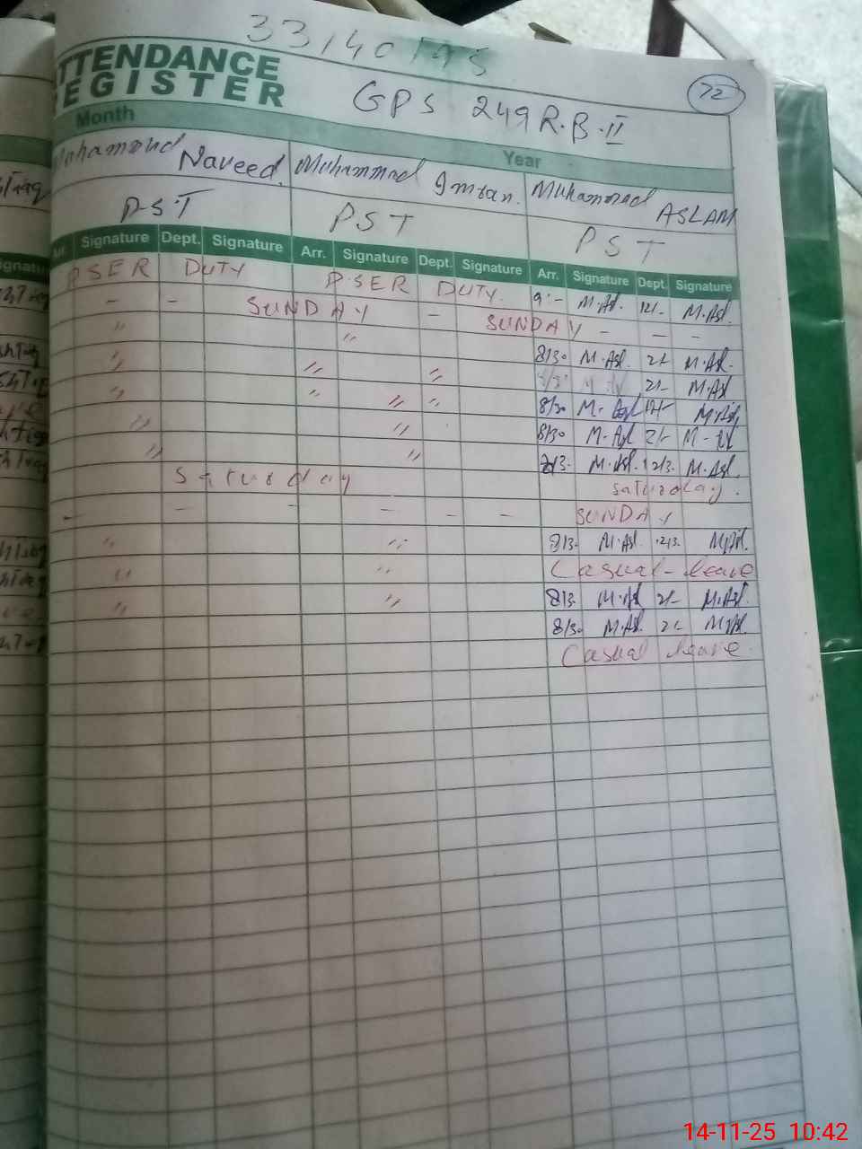 | CNIC | Full Name | Designation | R/C | Absence During Last Calender Month |