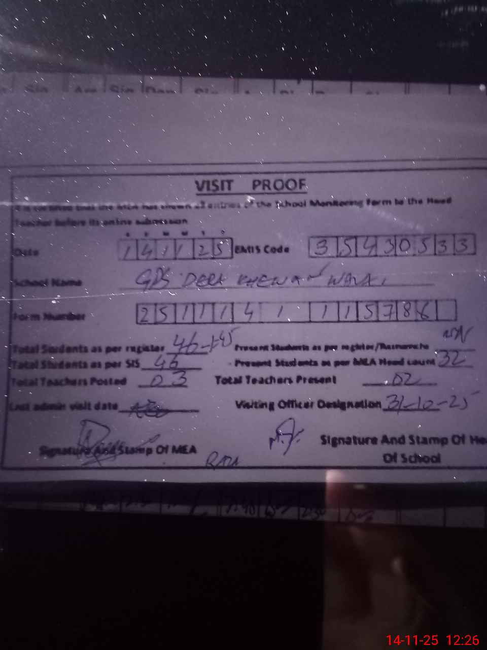 | Attendance Register | Head Teacher | MEA with School | Visit Proof |