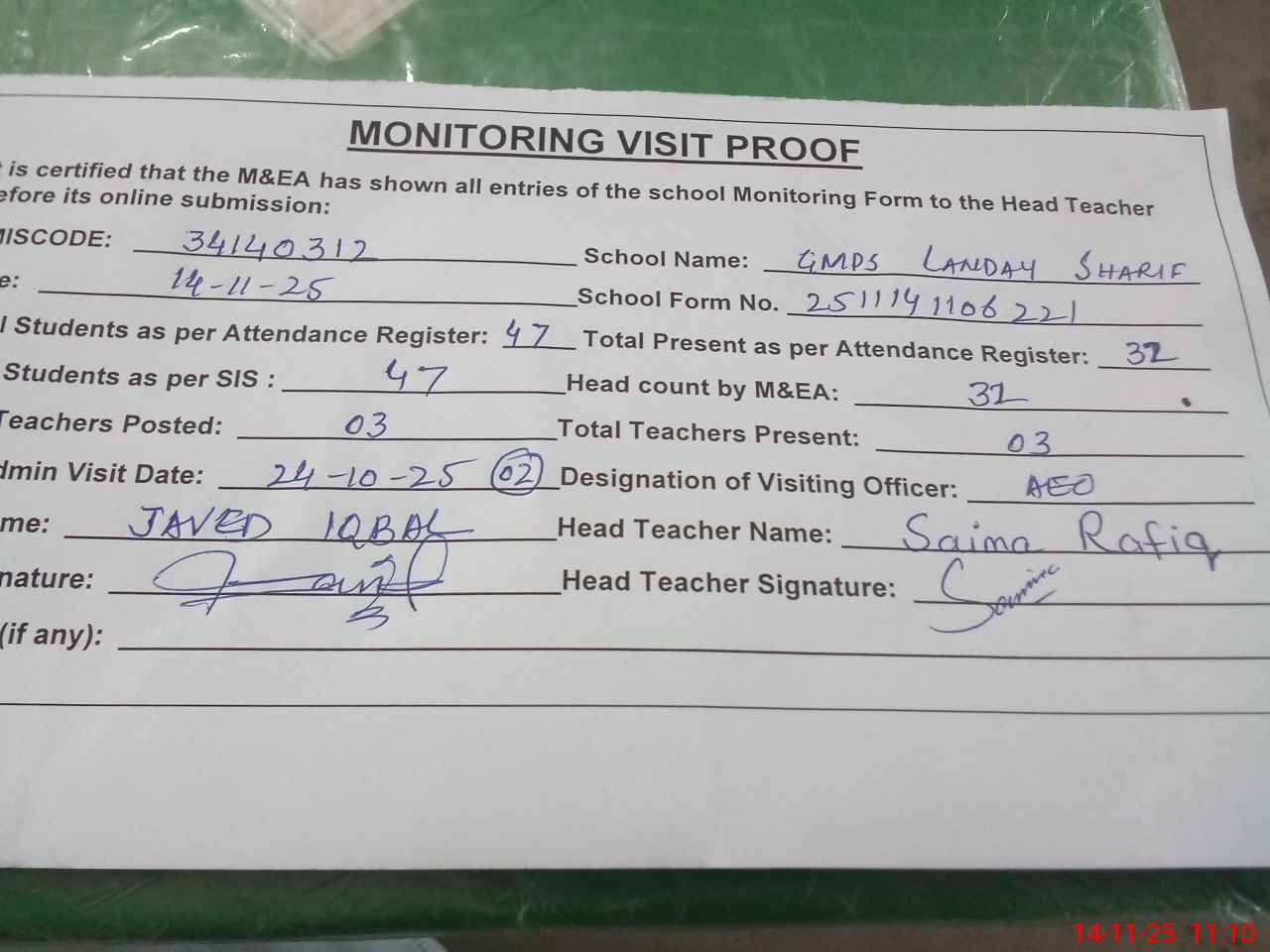 | Attendance Register | Head Teacher | MEA with School | Visit Proof |
