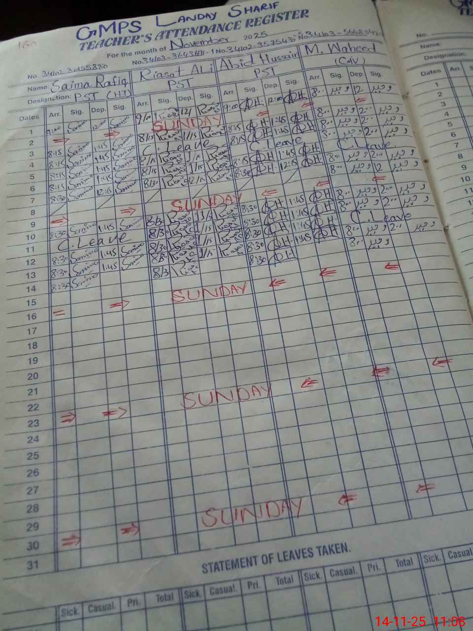 | CNIC | Full Name | Designation | R/C | Absence During Last Calender Month |