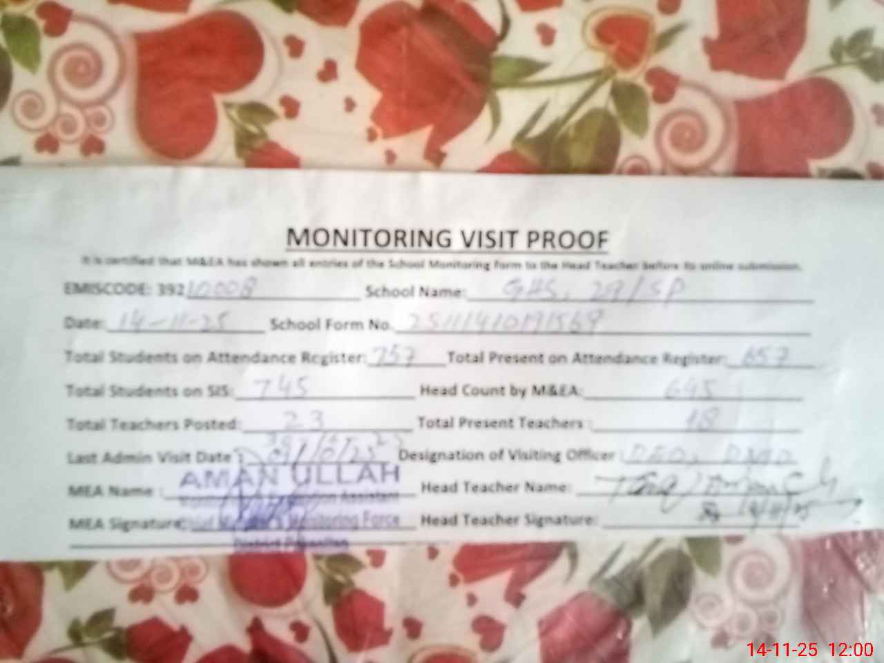 | EMIS Code: 39210008 | Name of School: GHS MODEL 29/SP PAKPATAN | |||