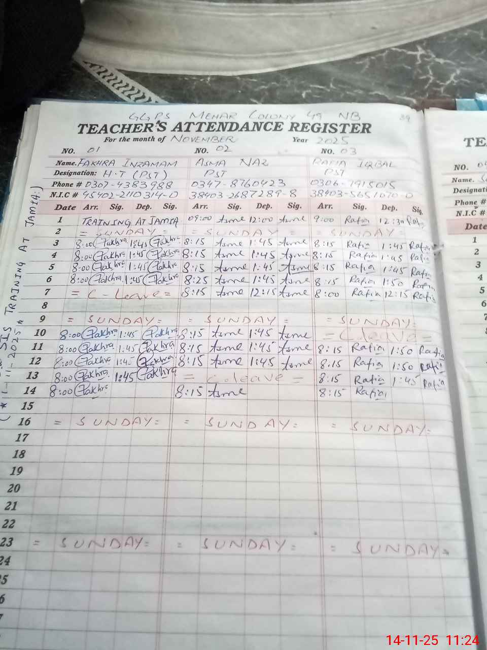 | CNIC | Full Name | Designation | R/C | Absence During Last Calender Month |