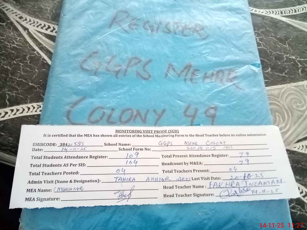 | Attendance Register | Head Teacher | MEA with School | Visit Proof |