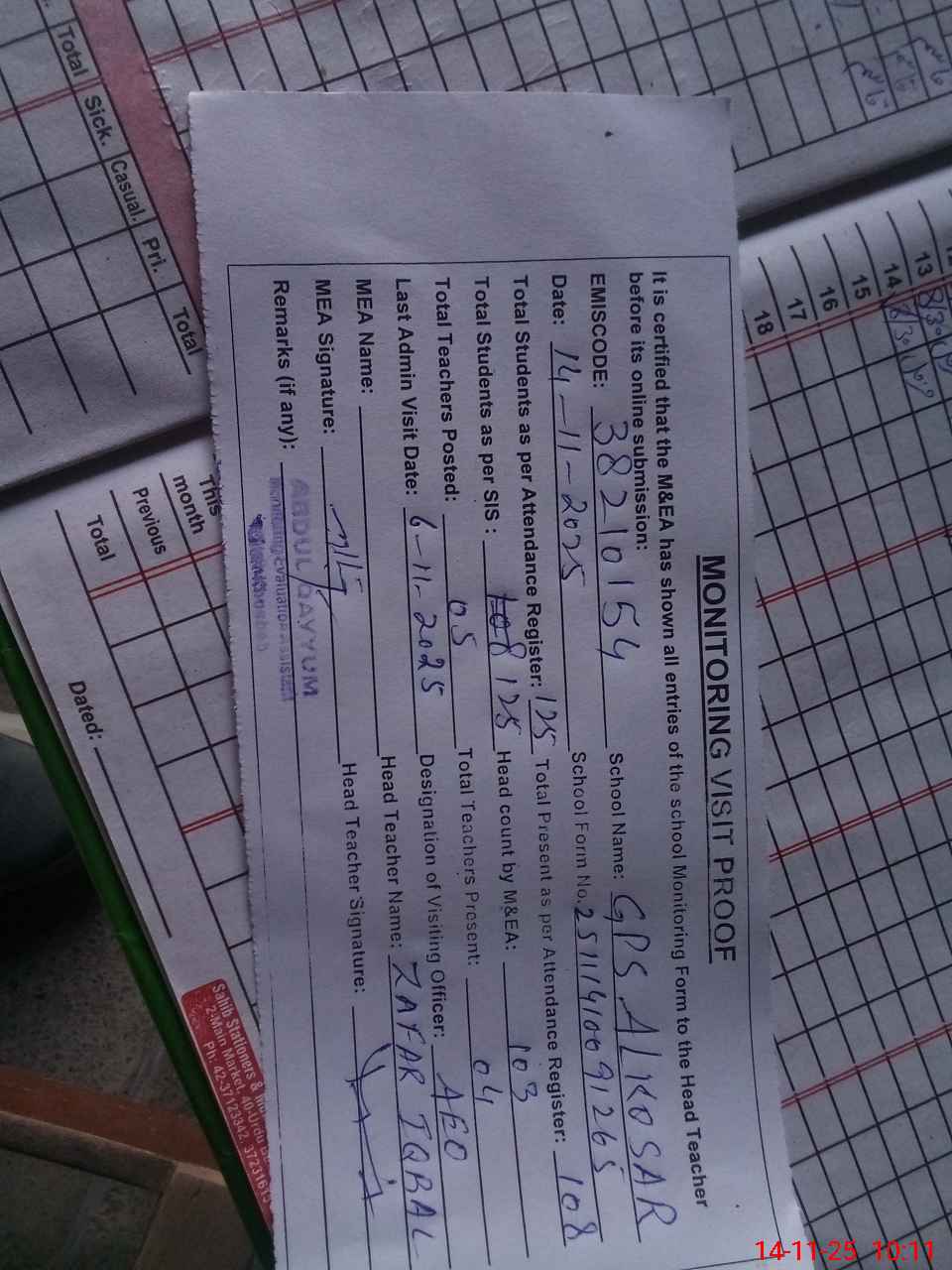 | Attendance Register | Head Teacher | MEA with School | Visit Proof |