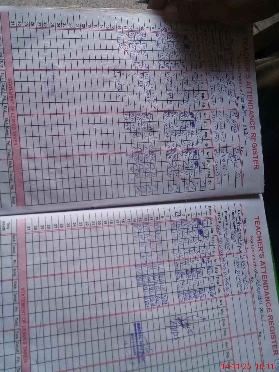 | CNIC | Full Name | Designation | R/C | Absence During Last Calender Month |