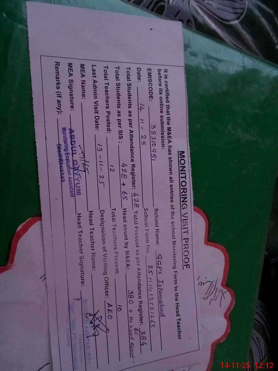 | EMIS Code: 38210951 | Name of School: GGPS ISLAM ABAD KHUSHAB | |||