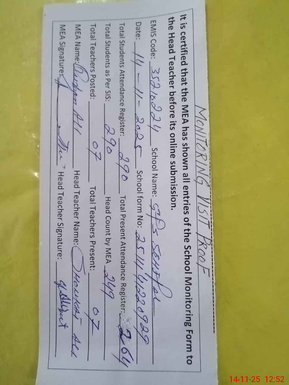 | Remarks (Use Separate Page if Required): Administrator visit of the Dy DEO not visited in 2025 Administrator visit of Assistant Education Officer 07th October 2025 and 28th October 2025 Total students Register 290 present students Register 264 Total students on SIS 290 Head Count students 249 Difference of students attendance 15 students | |||||