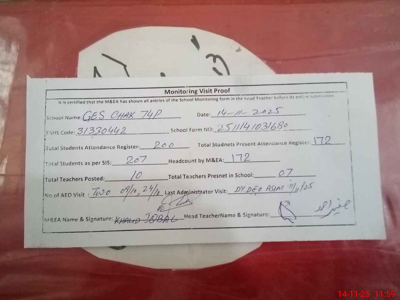 | Attendance Register | Head Teacher | MEA with School | Visit Proof |