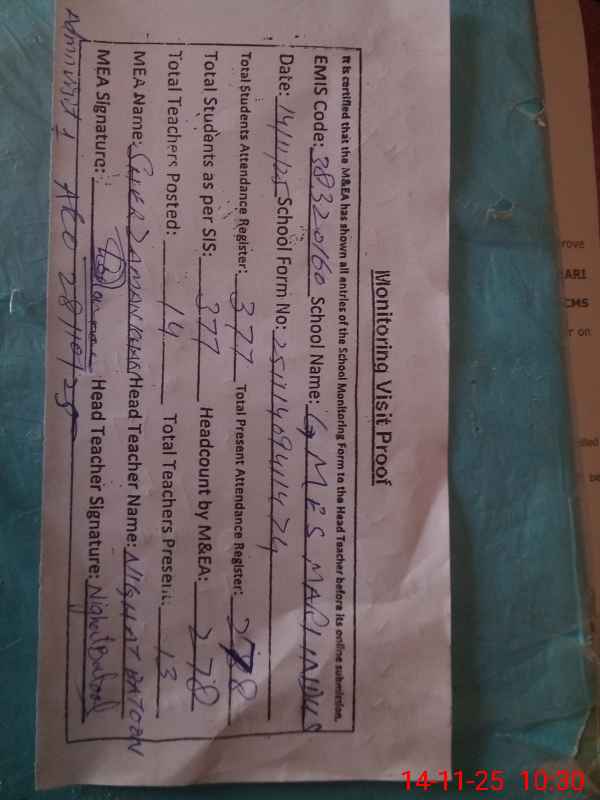 | Attendance Register | Head Teacher | MEA with School | Visit Proof |