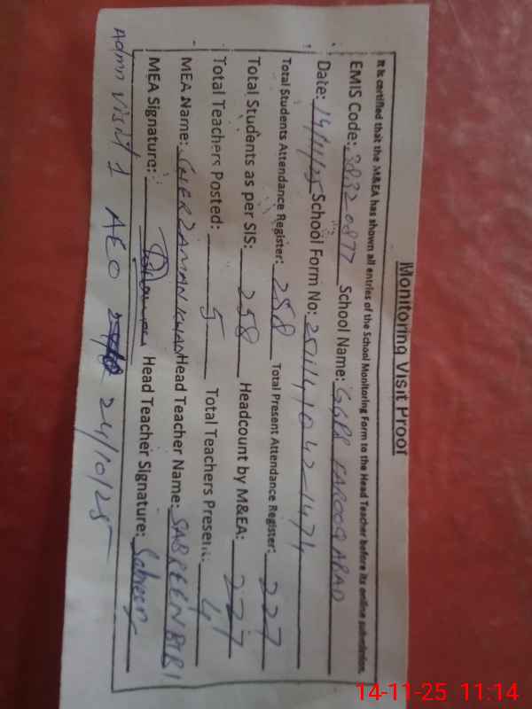 | Attendance Register | Head Teacher | MEA with School | Visit Proof |