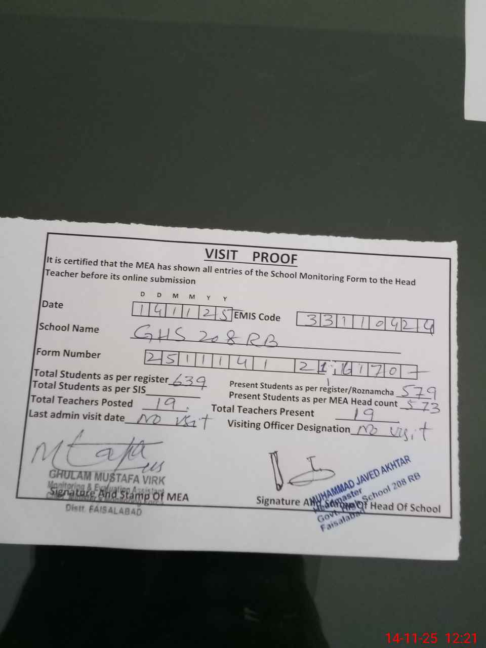 | Attendance Register | Head Teacher | MEA with School | Visit Proof |