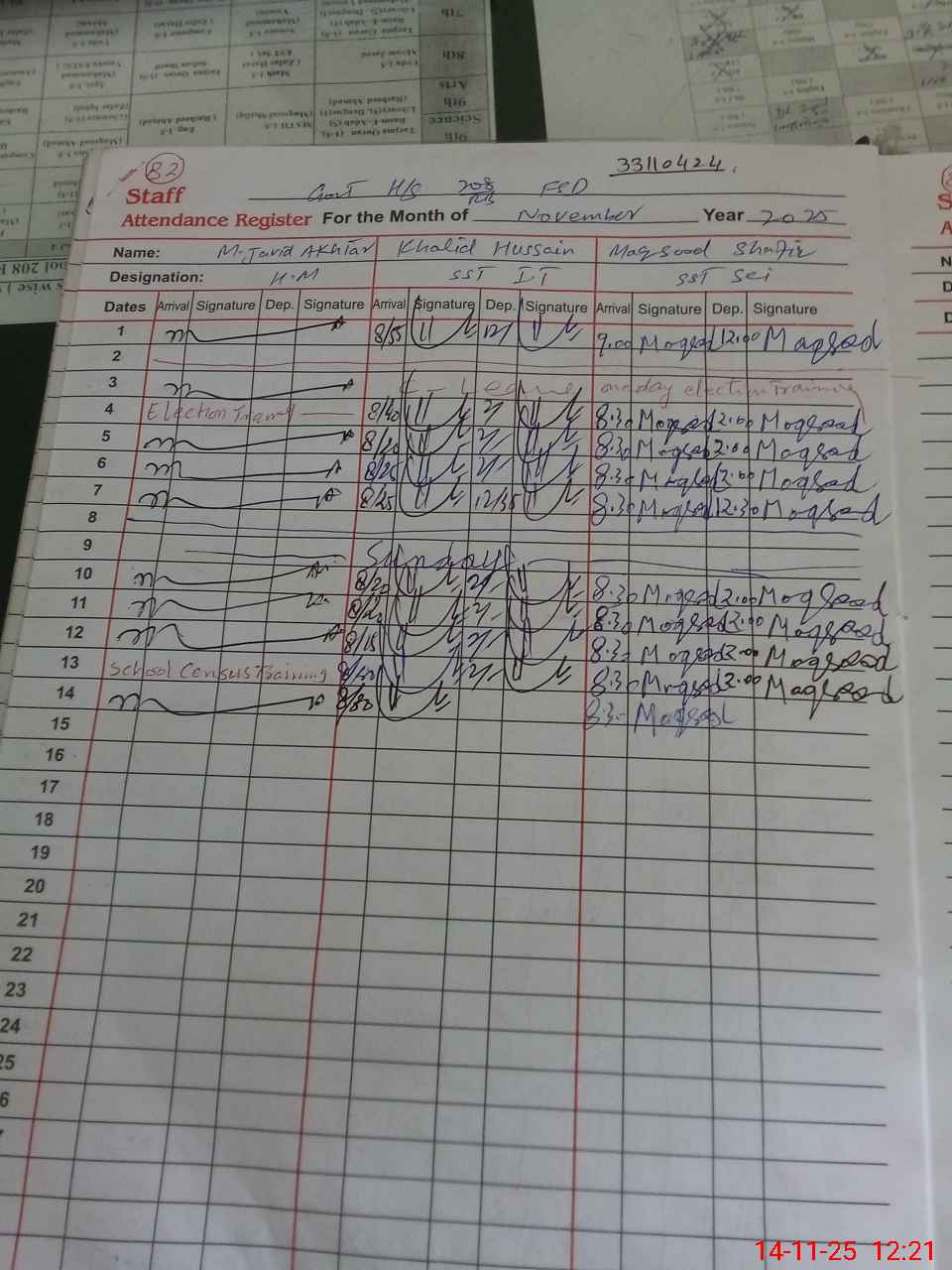 | CNIC | Full Name | Designation | R/C | Absence During Last Calender Month |