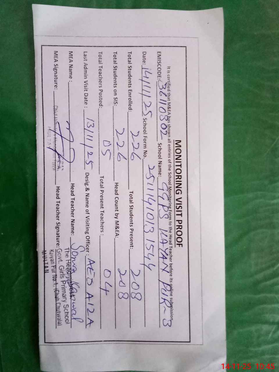 | EMIS Code: 36110302 | Name of School: GGPS KAYAN PUR NO 1 QASBA MARAL ROAD MULTAN | |||