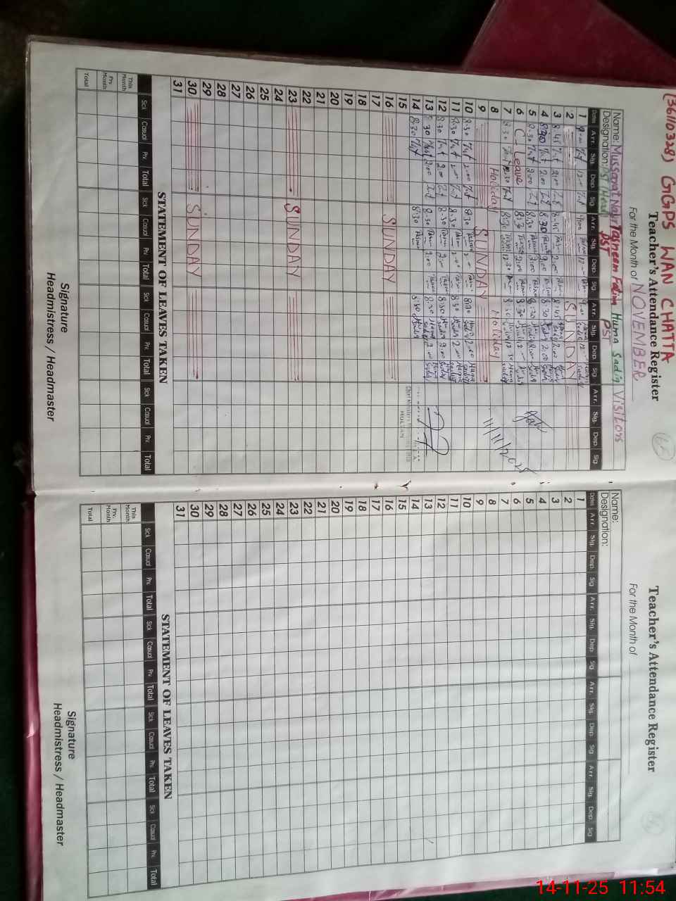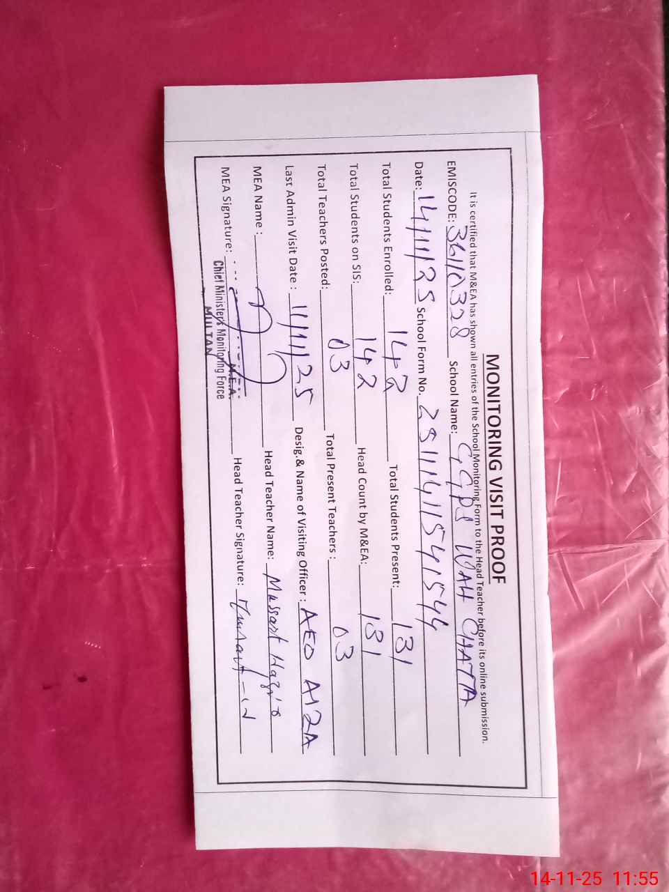 | Attendance Register | Head Teacher | MEA with School | Visit Proof |