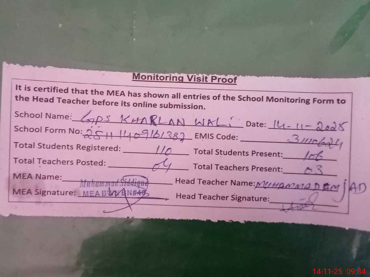 | Attendance Register | Head Teacher | MEA with School | Visit Proof |