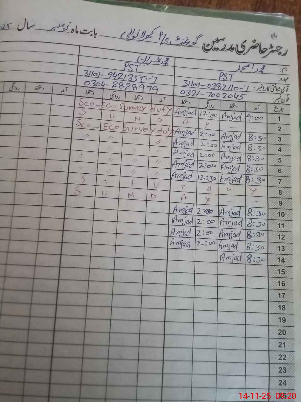 | CNIC | Full Name | Designation | R/C | Absence During Last Calender Month |