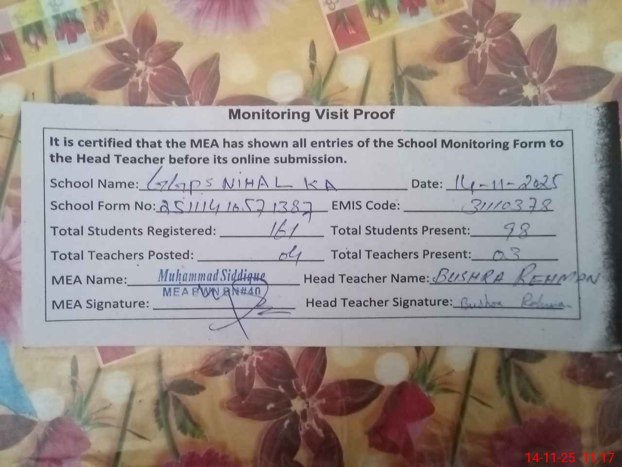 | EMIS Code: 31110378 | Name of School: GGPS NEHALKA | |||