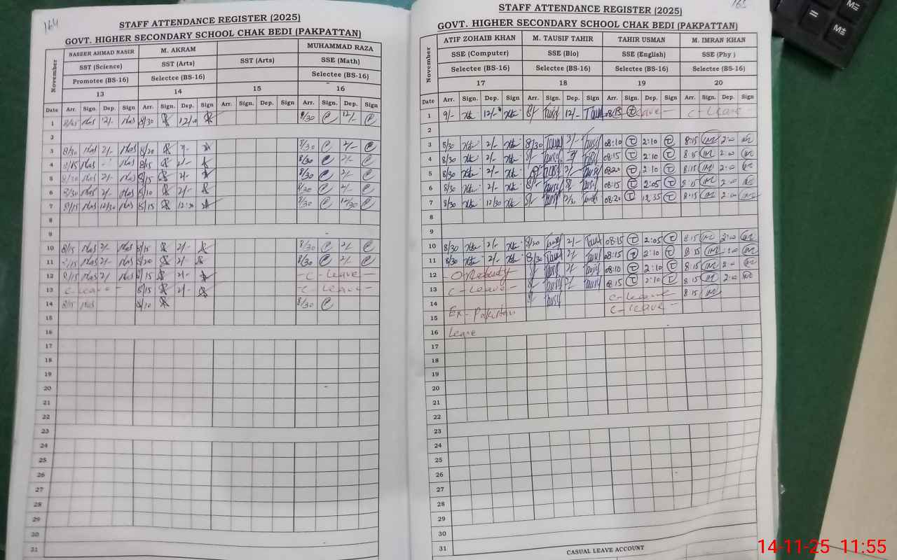| CNIC | Full Name | Designation | R/C | Absence During Last Calender Month |