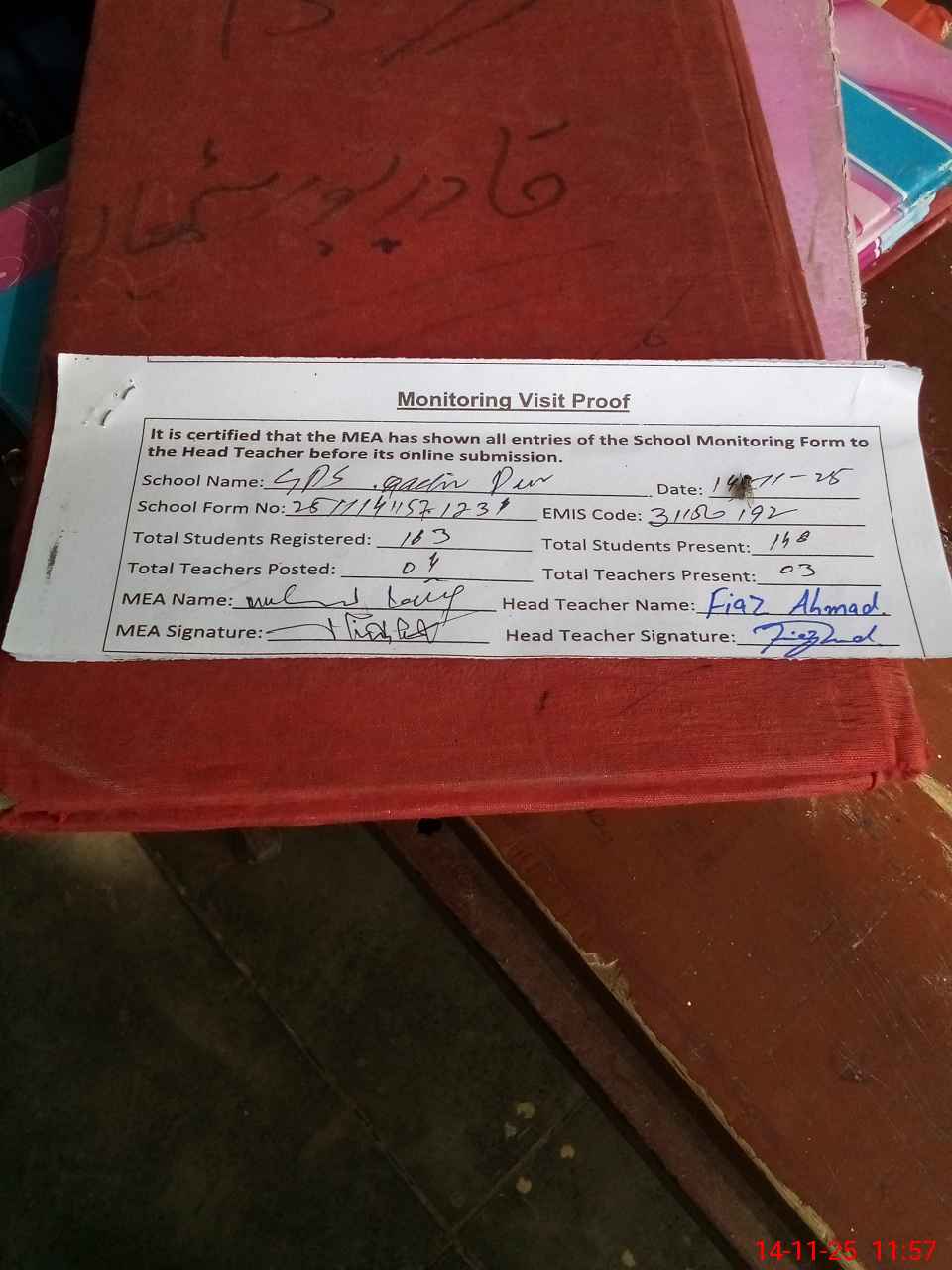 | EMIS Code: 31150192 | Name of School: GPS QADIR PUR SETHAN | |||