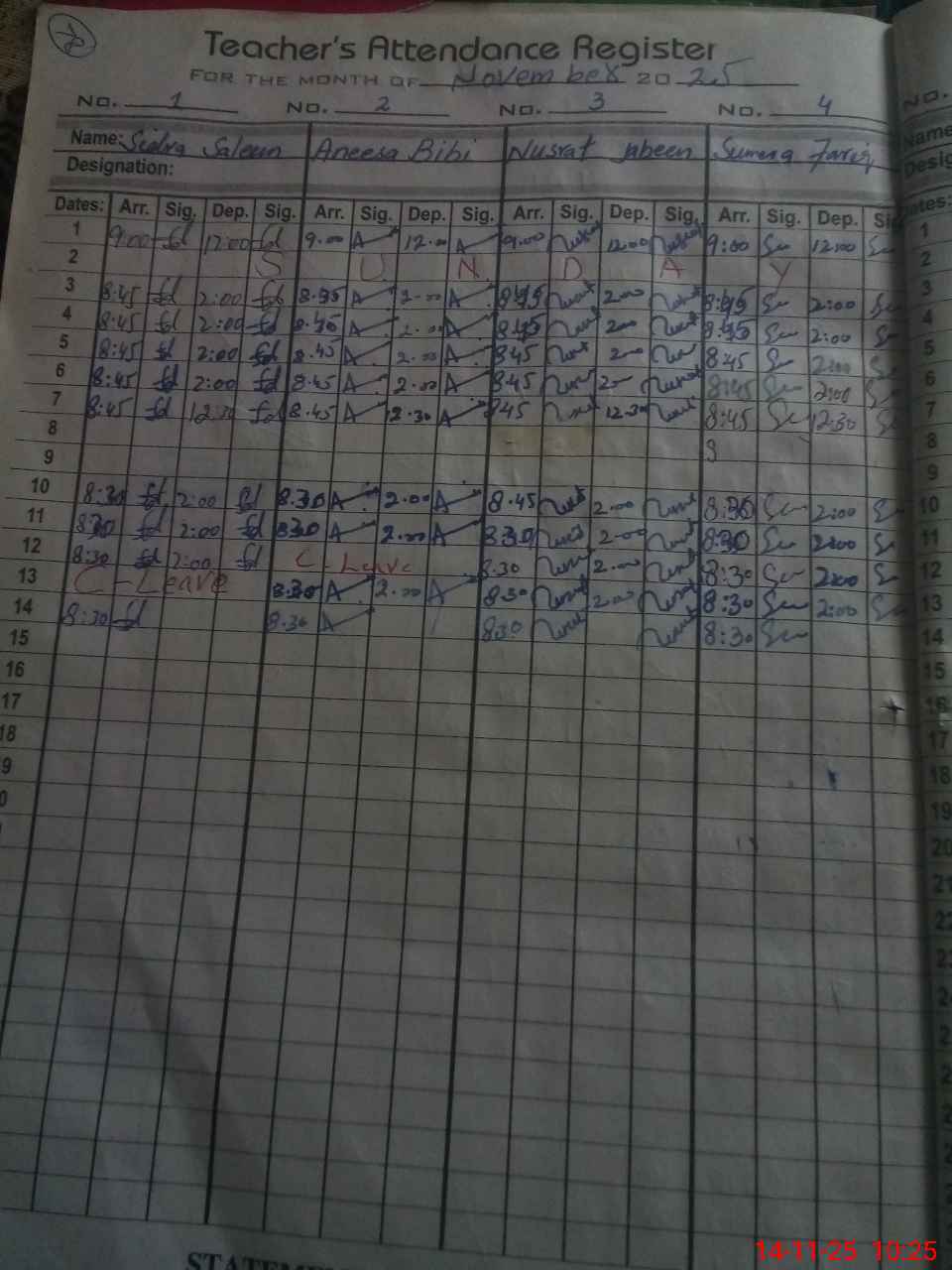 | CNIC | Full Name | Designation | R/C | Absence During Last Calender Month |