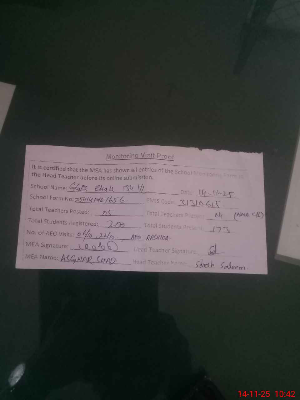 | Attendance Register | Head Teacher | MEA with School | Visit Proof |
