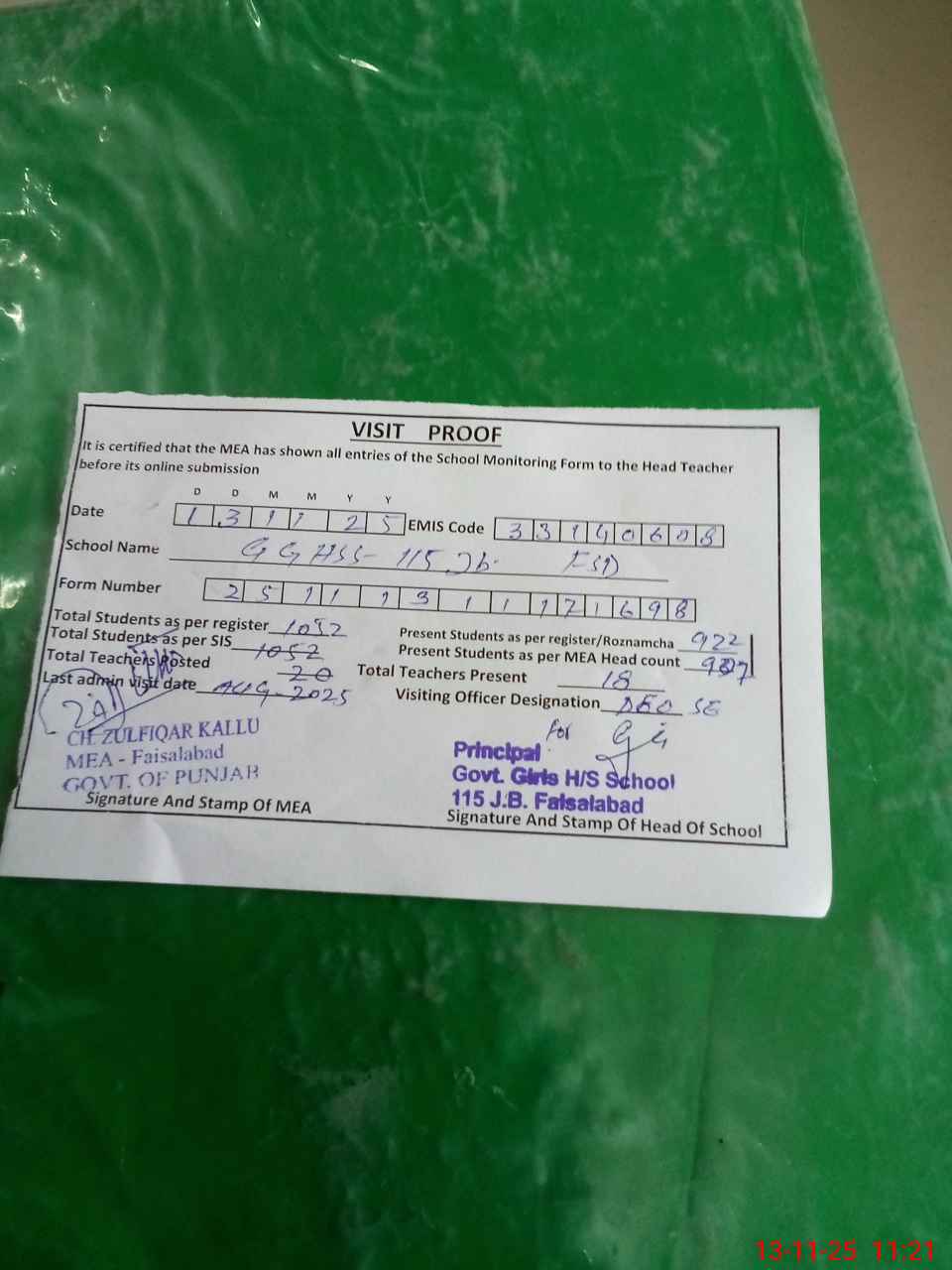 | EMIS Code: 33140608 | Name of School: GGHSS CHAK 115 JB FSD | |||