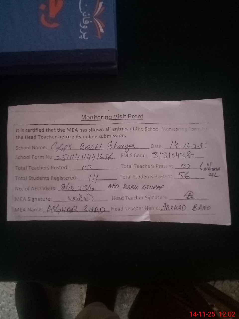 | Attendance Register | Head Teacher | MEA with School | Visit Proof |