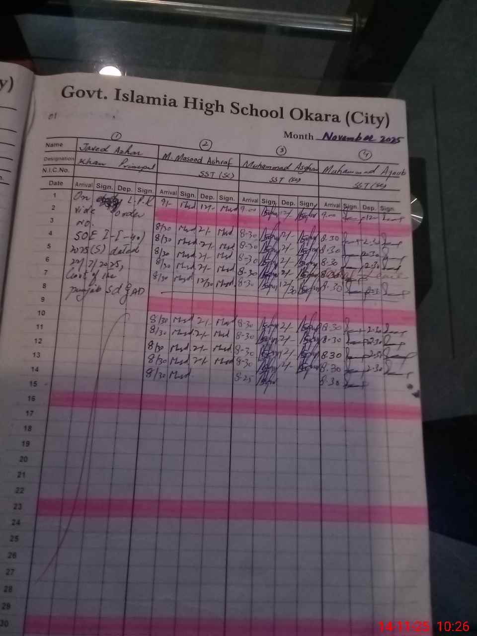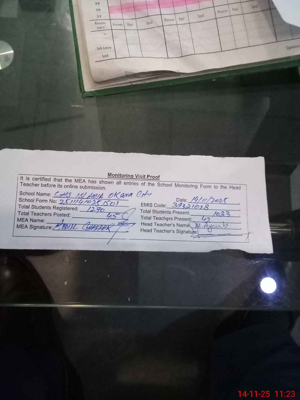 | Remarks (Use Separate Page if Required): 01 teacher named Muhammad wahab Khan EST absent from the school since 28 October 2025 | |||||