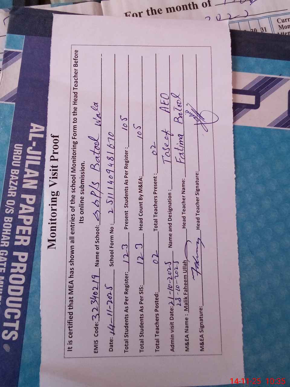 | Attendance Register | Head Teacher | MEA with School | Visit Proof |