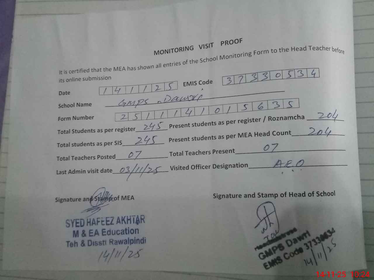 | Certified that this School was Inspected by the Undersigned MEA/DMO Today and the Information Stated Above is as Per Record. | |||||