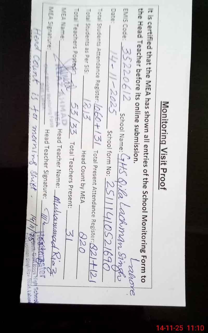 | EMIS Code: 35220612 | Name of School: GHS QILA LACHMAN SINGH (EX-MCL) | |||