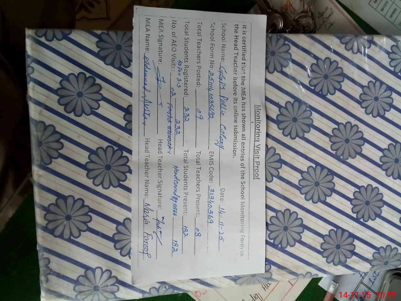 | Attendance Register | Head Teacher | MEA with School | Visit Proof |