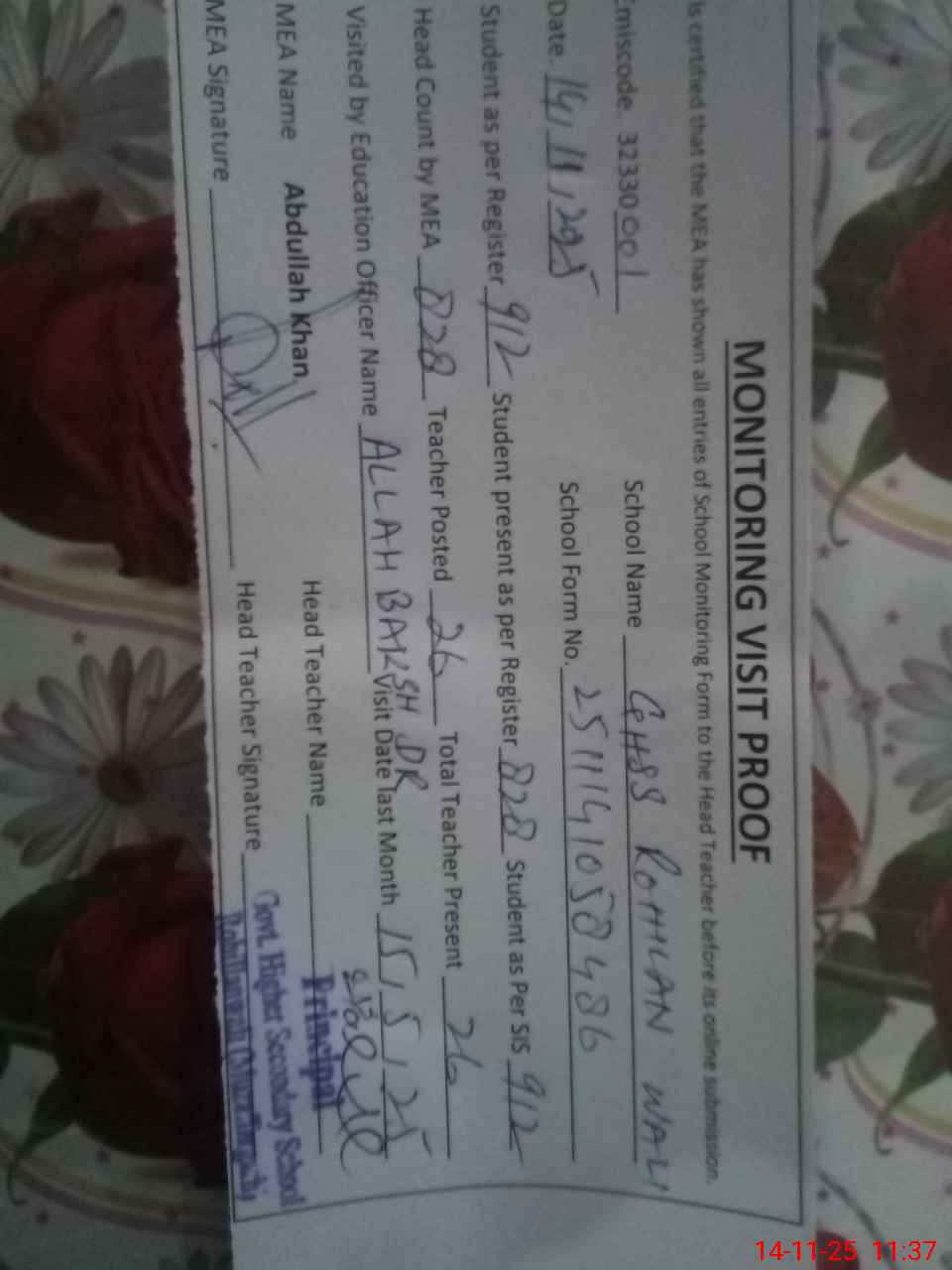 | EMIS Code: 32330001 | Name of School: GHSS ROHILLAN WALI | |||
