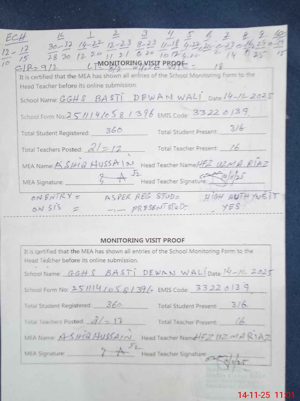 | Attendance Register | Head Teacher | MEA with School | Visit Proof |