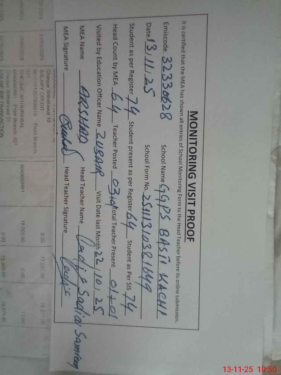 | Attendance Register | Head Teacher | MEA with School | Visit Proof |
