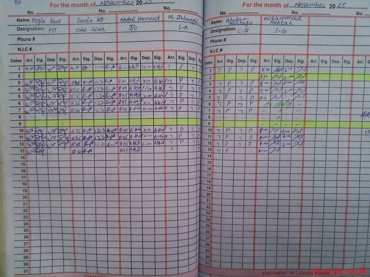 | CNIC | Full Name | Designation | R/C | Absence during last cal. month |