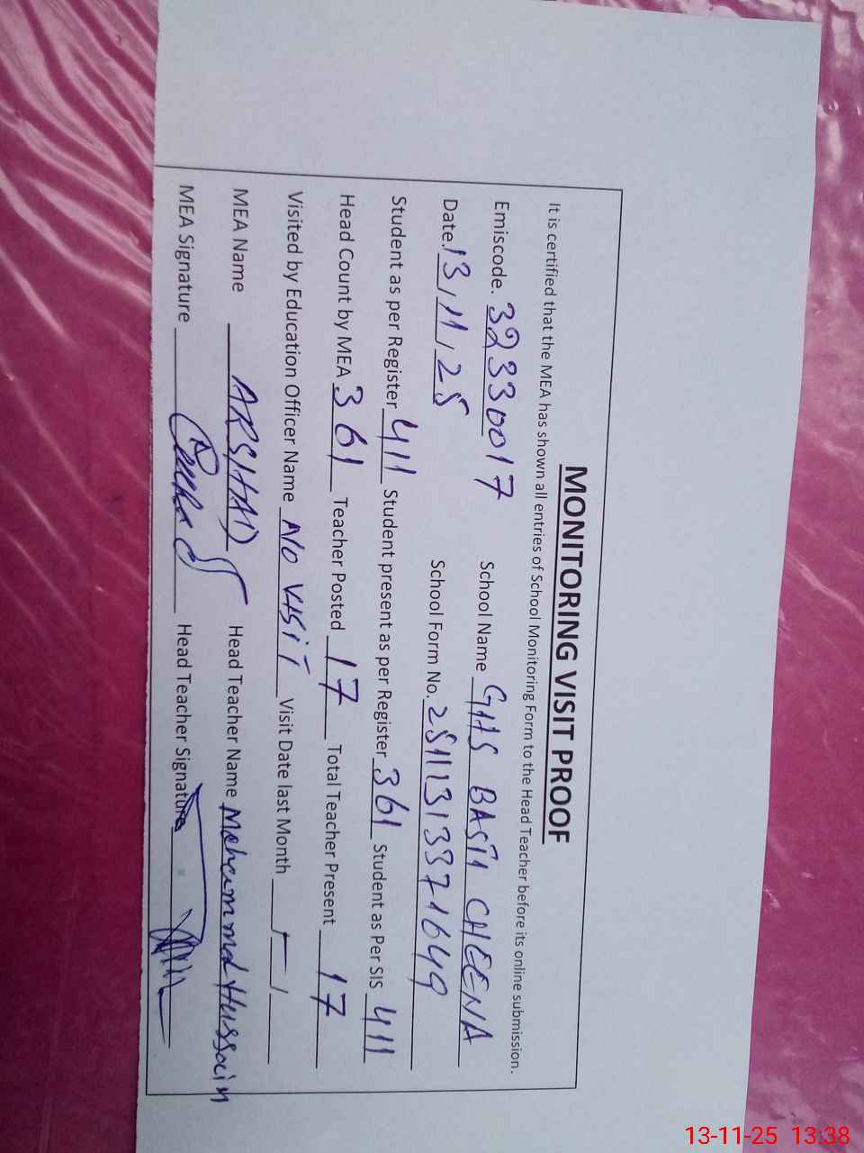 | Attendance Register | Head Teacher | MEA with School | Visit Proof |