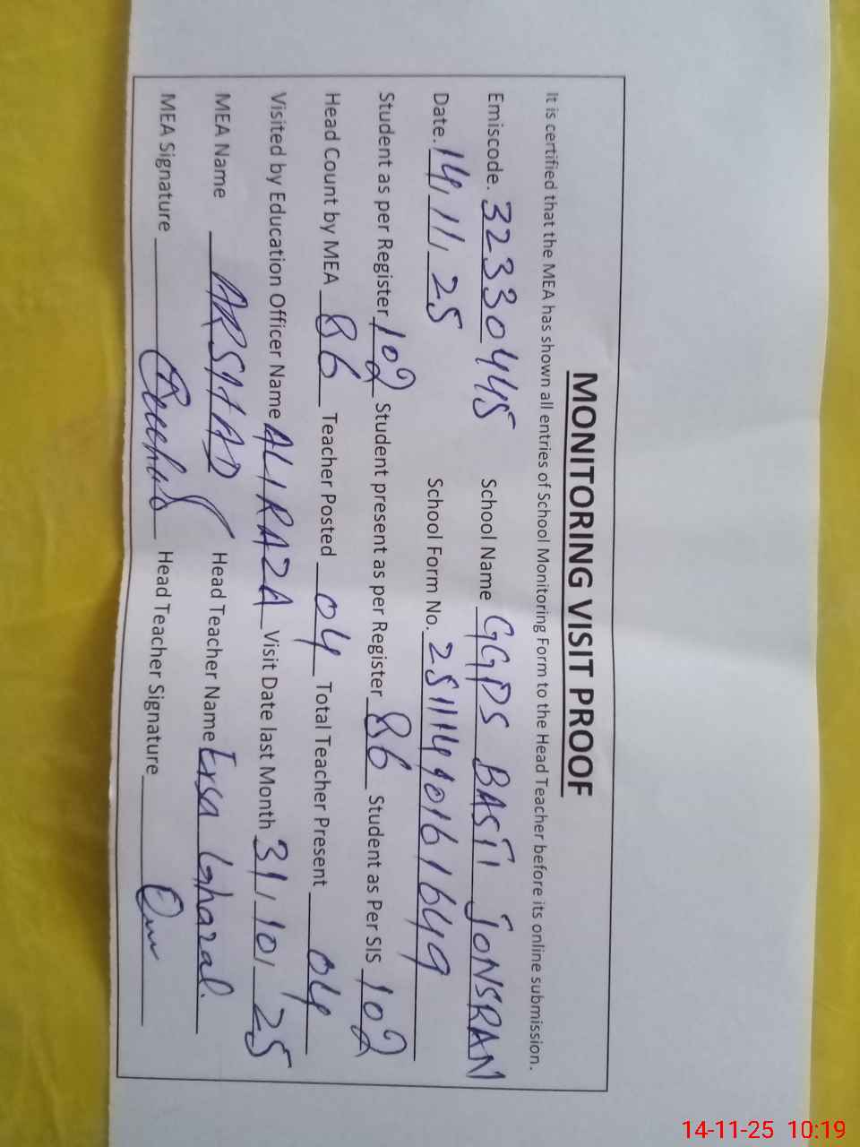 | Attendance Register | Head Teacher | MEA with School | Visit Proof |