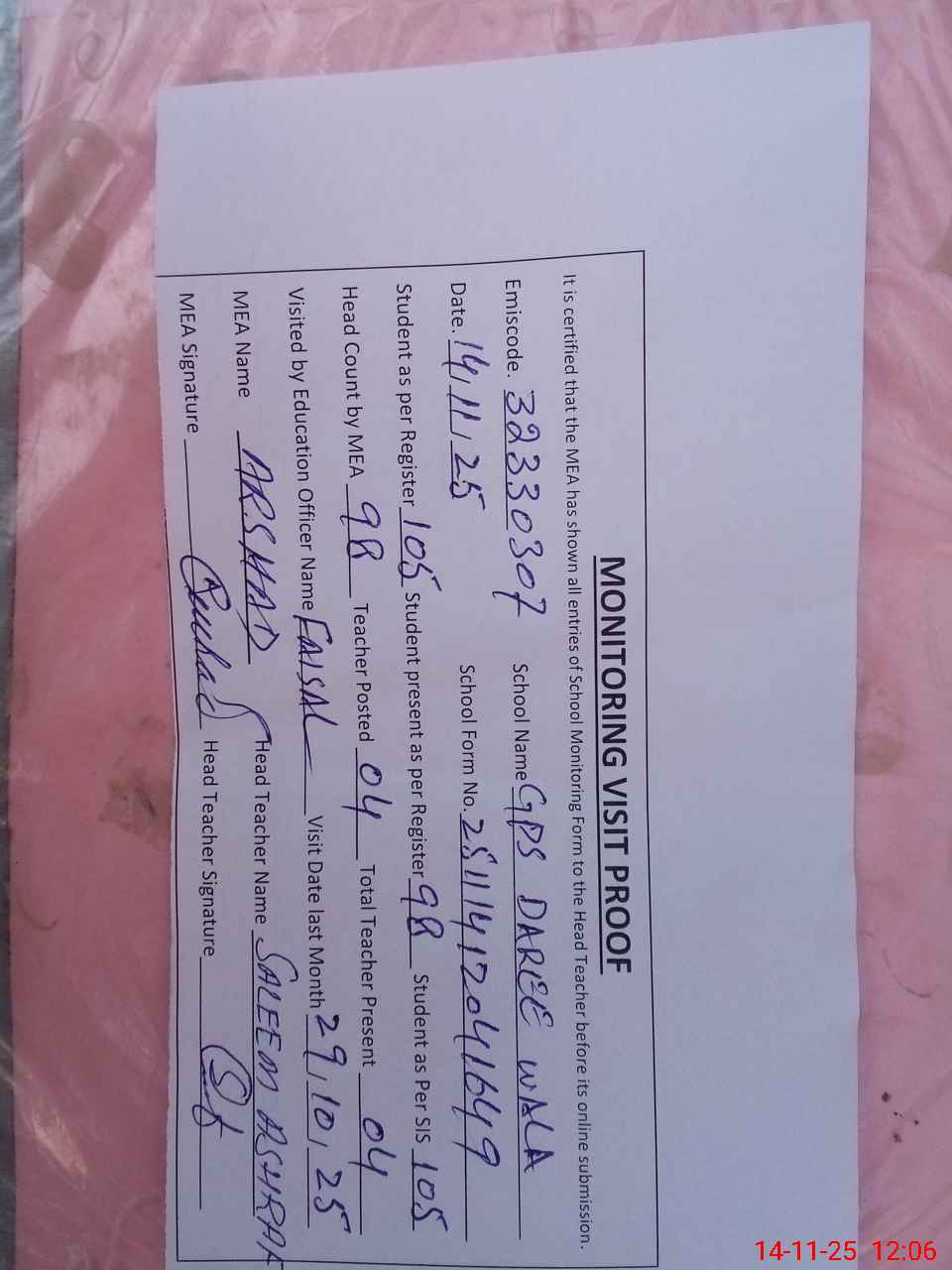 | Attendance Register | Head Teacher | MEA with School | Visit Proof |