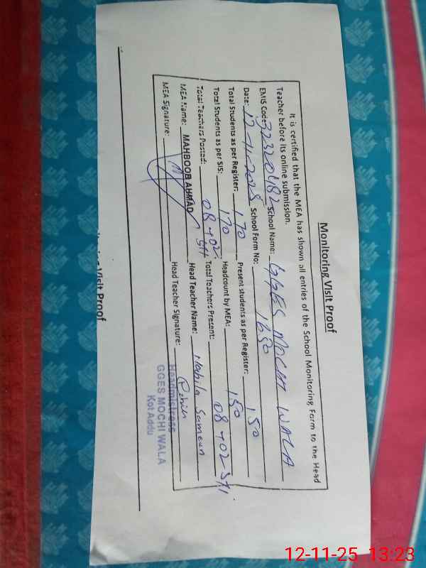 | EMIS Code: 32320482 | Name of School: GGES MOCHI WALA | |||