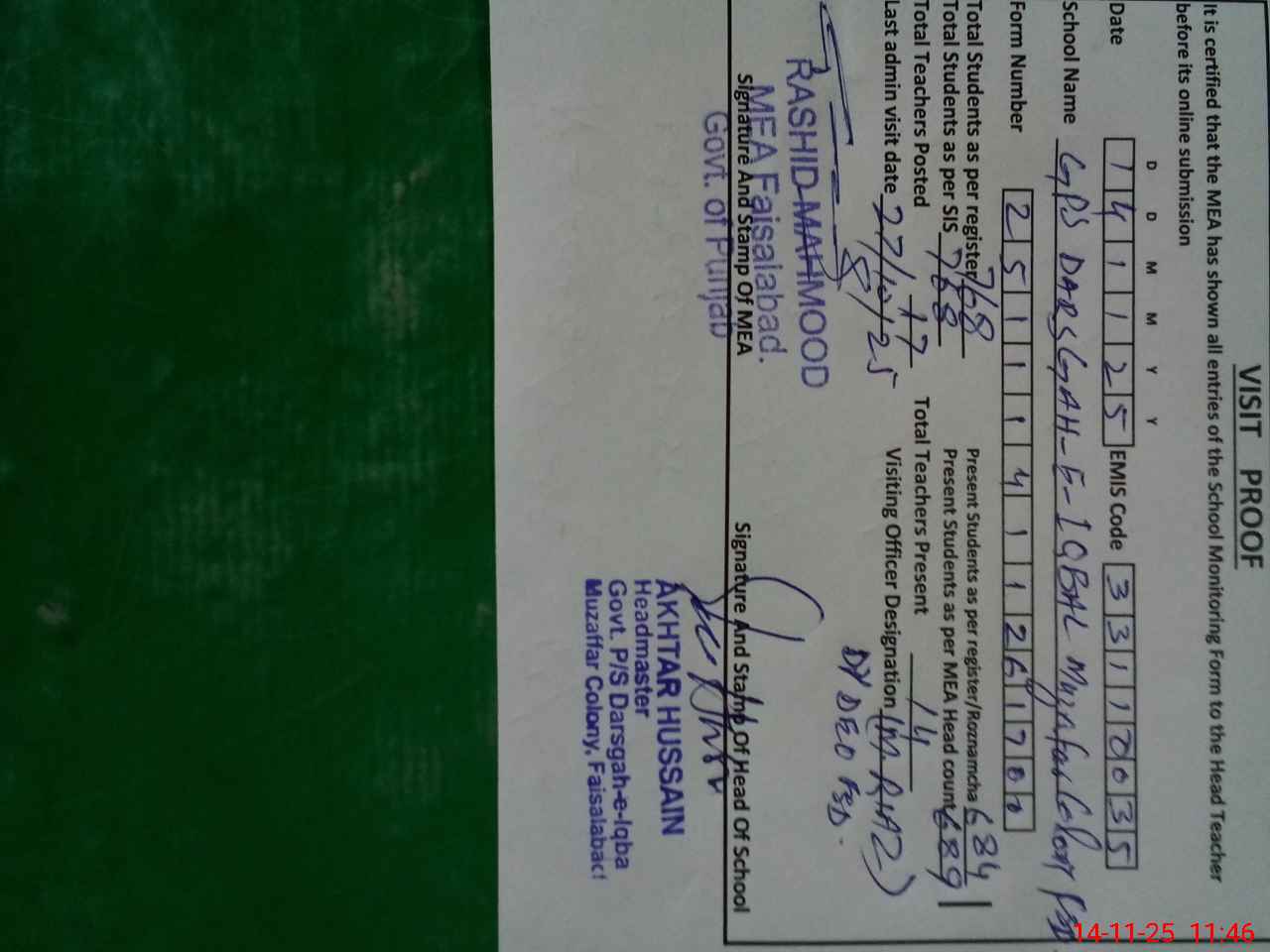 | EMIS Code: 33110035 | Name of School: GPS DARGHA E IQBAL MUZAFAR COLONY FSD | |||