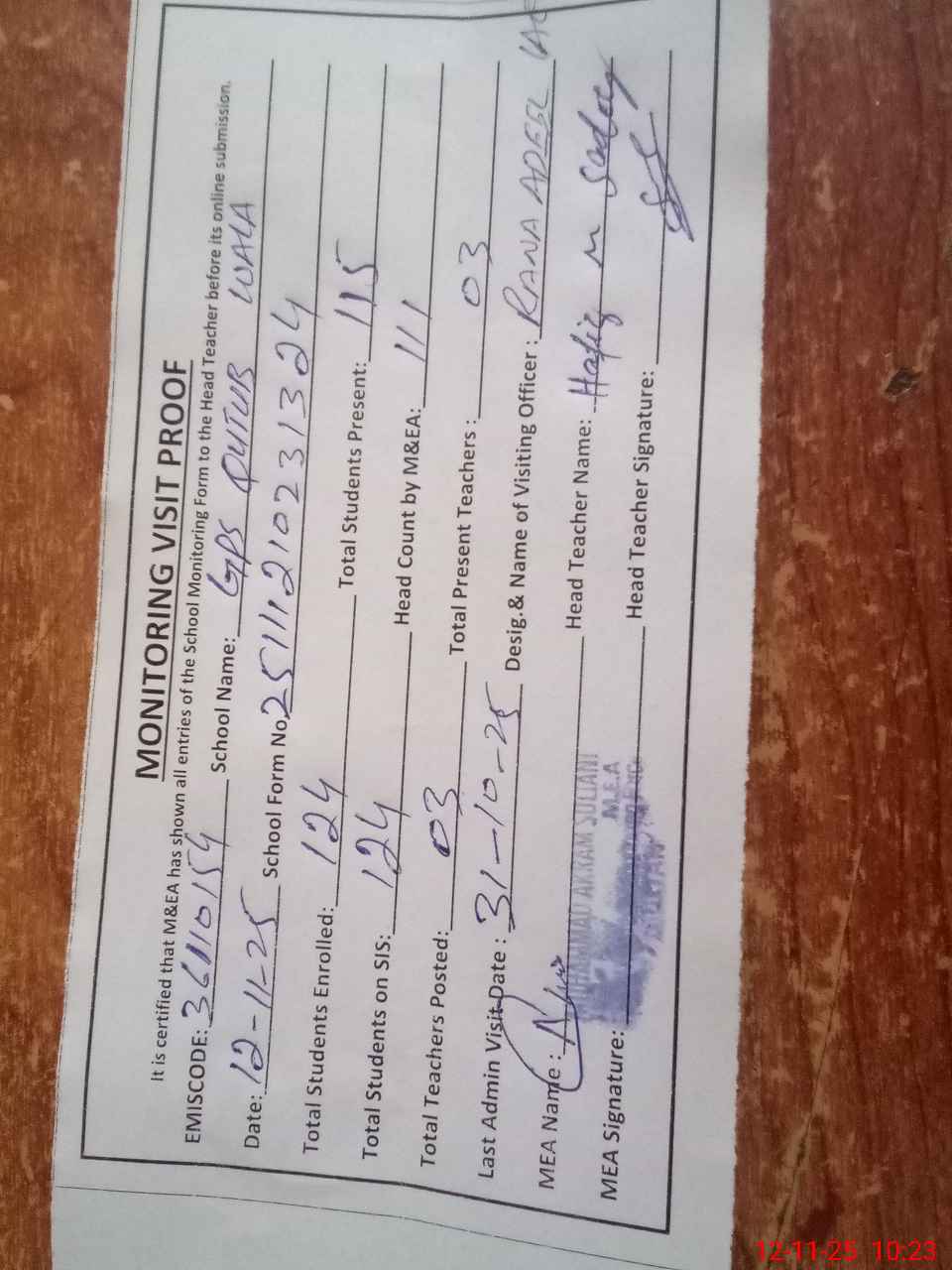 | Attendance Register | Head Teacher | MEA with School | Visit Proof |