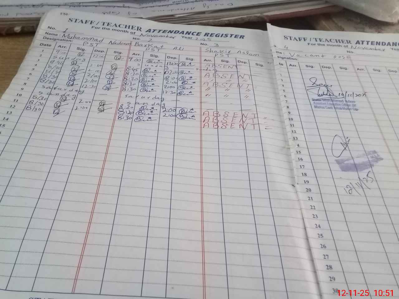 | CNIC | Full Name | Designation | R/C | Absence During Last Calender Month |