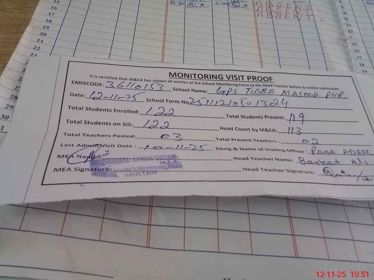 | Attendance Register | Head Teacher | MEA with School | Visit Proof |