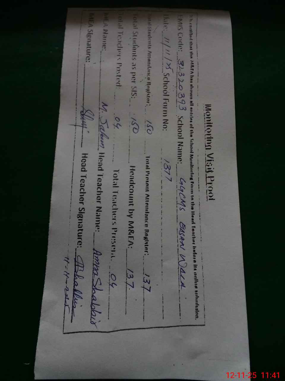 | Attendance Register | Head Teacher | MEA with School | Visit Proof |