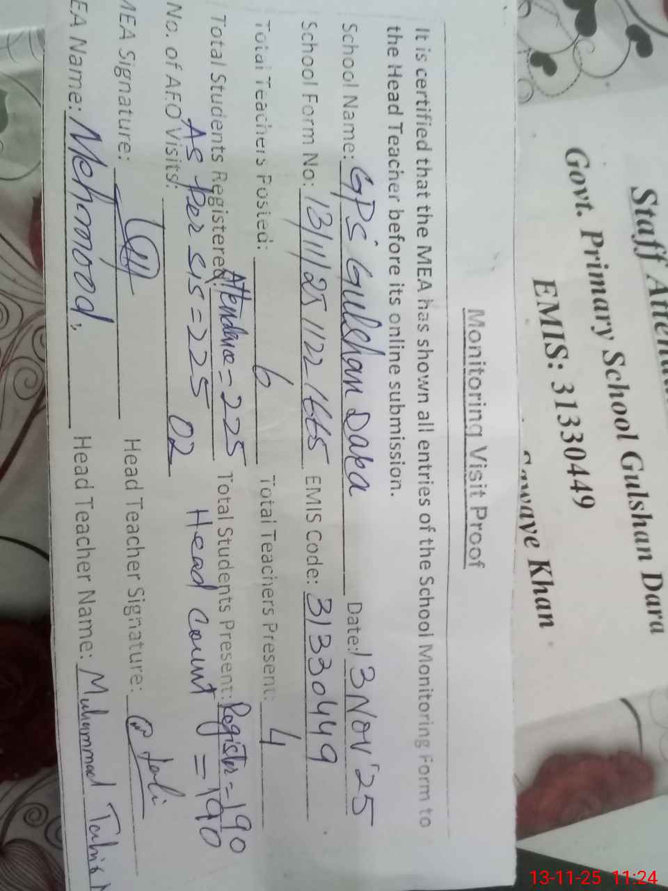 | EMIS Code: 31330449 | Name of School: GPS GULSHANDARA | |||