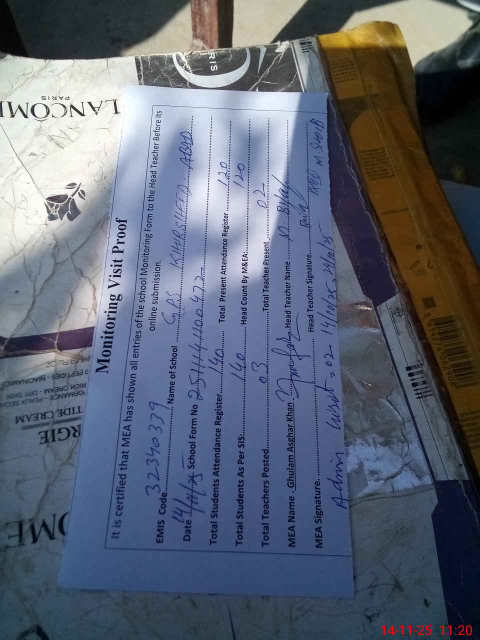 | Attendance Register | Head Teacher | MEA with School | Visit Proof |