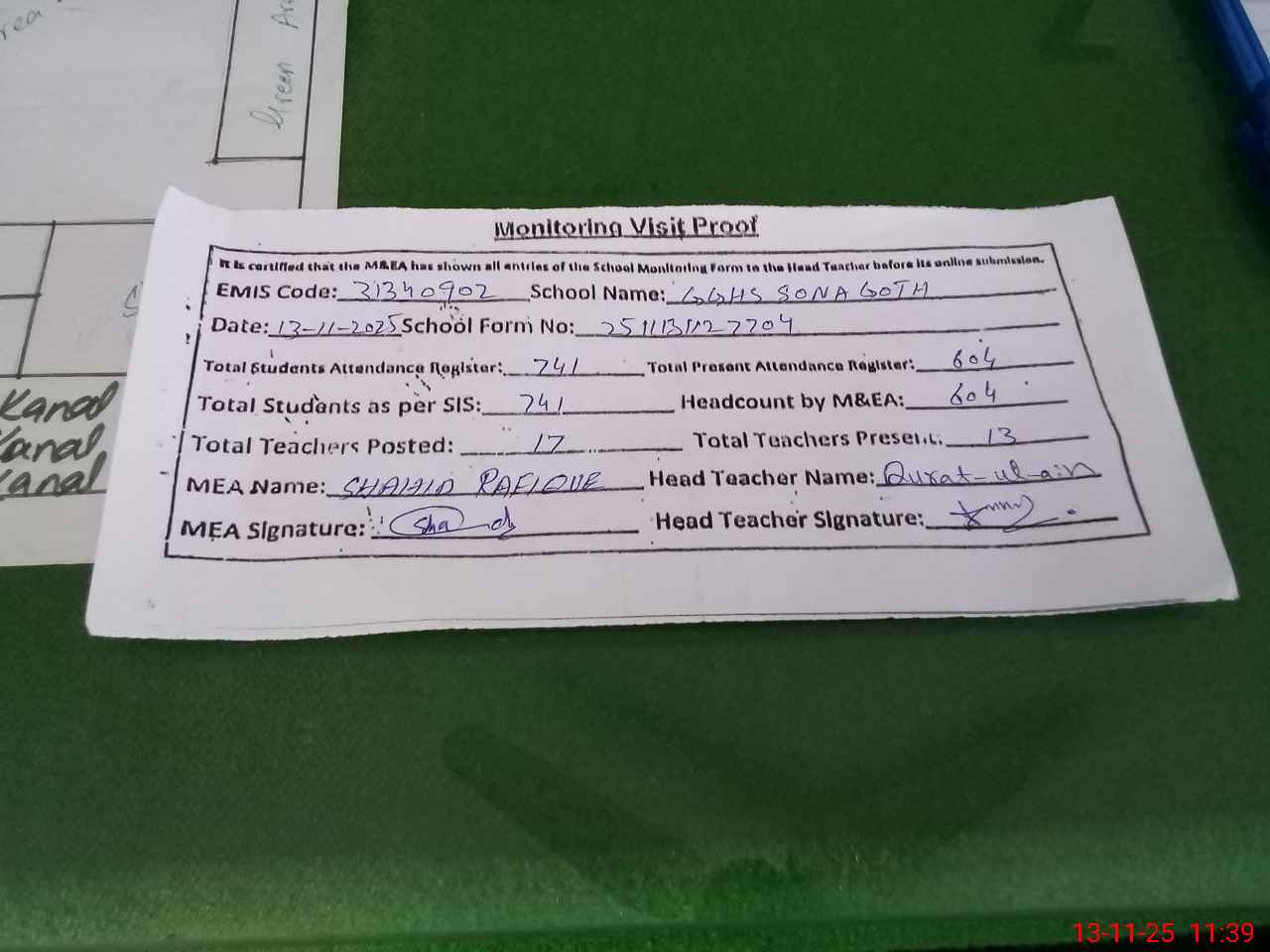 | Attendance Register | Head Teacher | MEA with School | Visit Proof |
